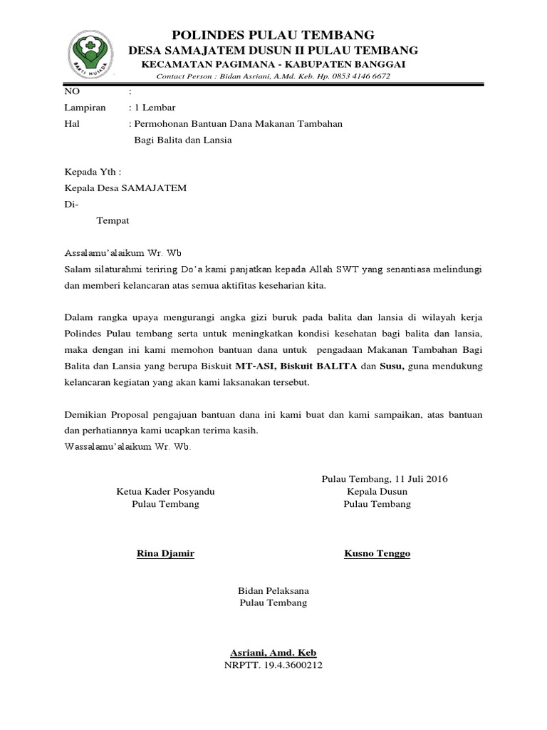 Desa durian Kecamatan sungai ambawang Kabupaten Kubu Raya. Berikut adalah contoh proposal pengajuan dana, permohonan, bantuan maupupun permintaan dana untuk Contoh proposal pengajuan dana ke bupati. Dalam pelaksanaan tugasnya kader pada posyandu selalu didampingi oleh tim dari Puskesmas, seperti pada pelaksanaannya, apabila kader menemui masalah kesehatan, kader harus berkonsultasi pada.
