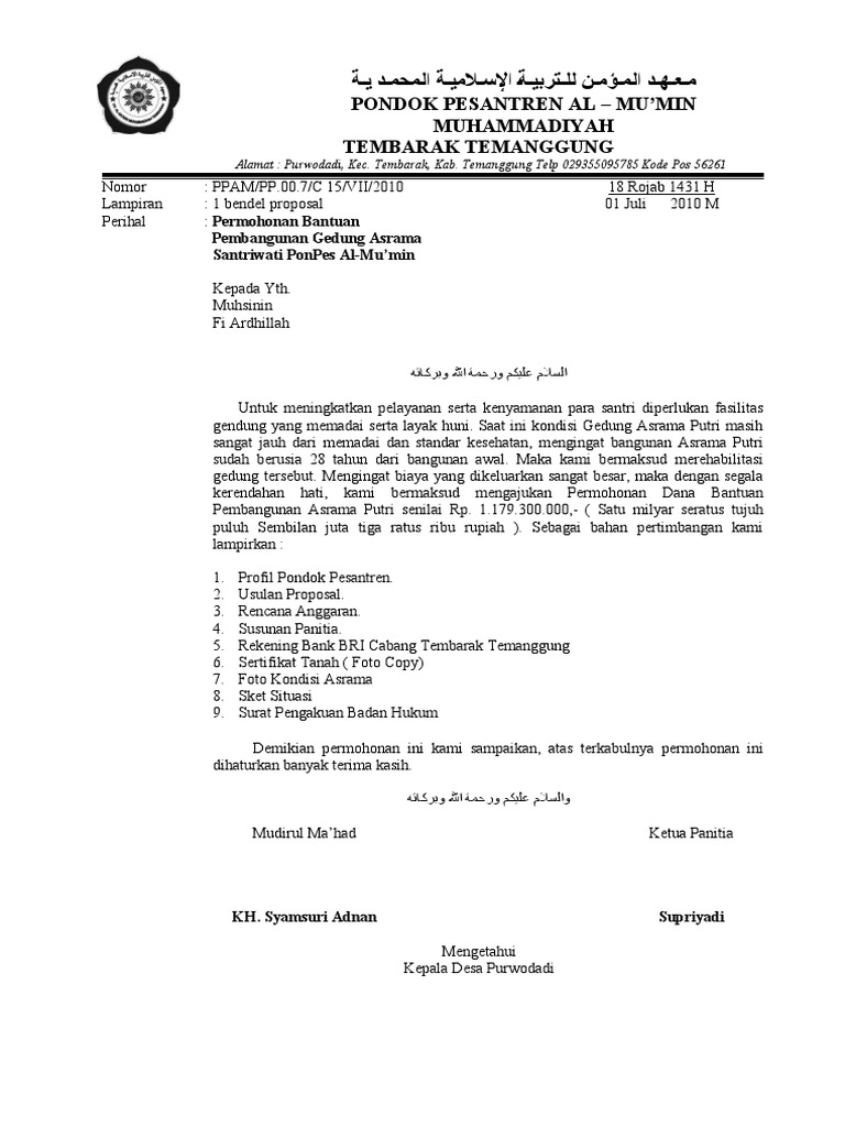 Dengan proposal ini pula kami sangat mengharapan agar semua pihak yang berkompeten dapat menyalurkan dana bantuan " Kegiatan Rehabilitasi AsramaPondok Pesantren Dar Al Qur'an Desa Tegalgubug Lor Kec. Untuk merealisasikan pengadaan pembangunan gedung RA Fathul 'Ulum Karangtalun Kecamatan Tanon, Kabupaten Sragen membutuhkan dana sebesar Rp. Contoh Surat » Surat Permohonan » Contoh Surat Permohonan Bantuan Dana Pembangunan Masjid.